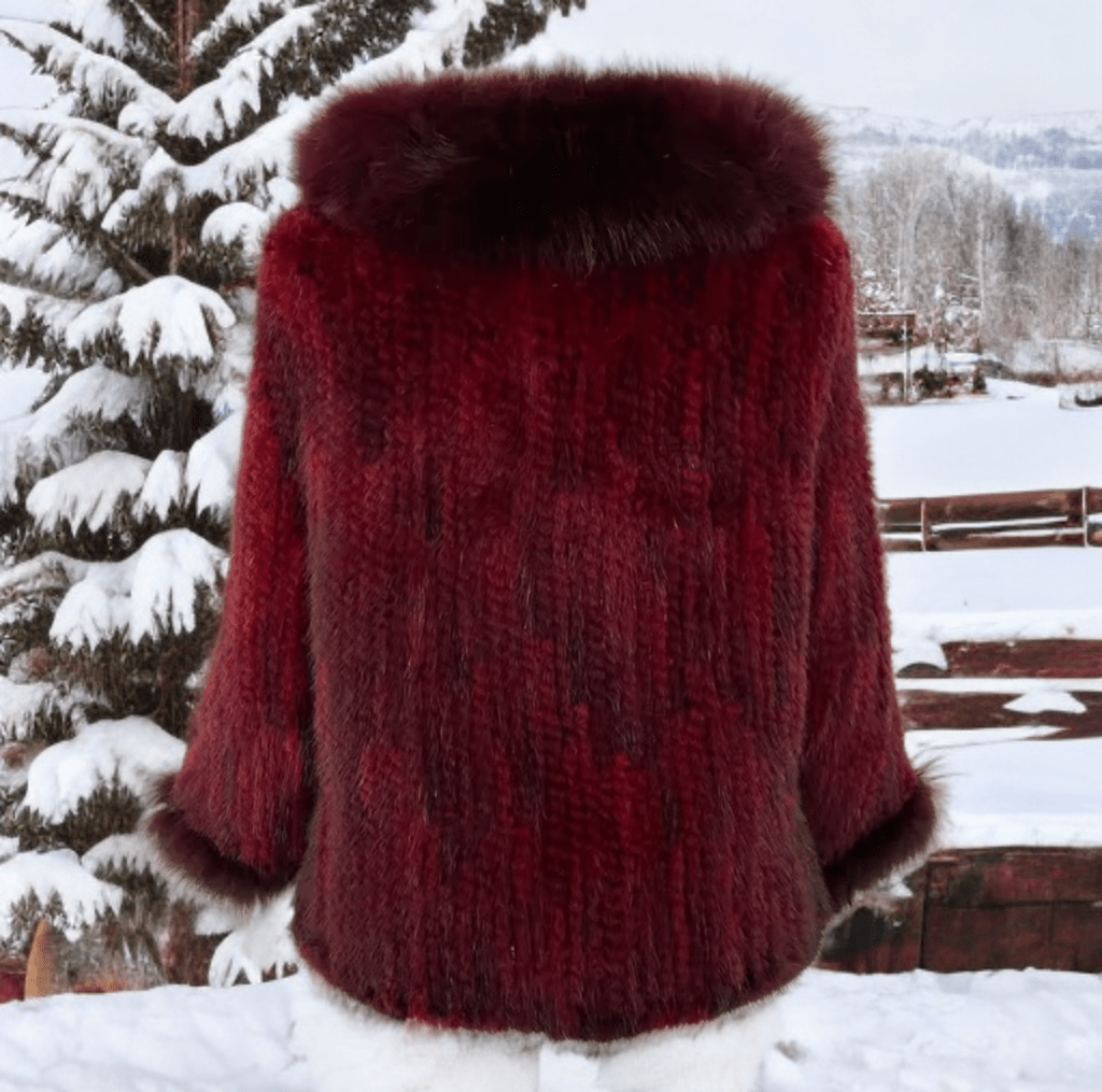 Bolerko z futra,futrem futrzana peleryna z norek bordowe uszyte z wysokiej jakości futra norek plecionych wykończone lisem naturalnym w kolorze bordowym, przepiękne, modne, stylowe i niezwykle miękkie w dotyku. Futerko z norek w stylu ovesizowym z głębokim kołnierzem, zapinane na haftki. Model idealny sprawdza się na sukienki czy eleganckie przyjęcia zarzucone na białą koszulę czy elegancki sweter.