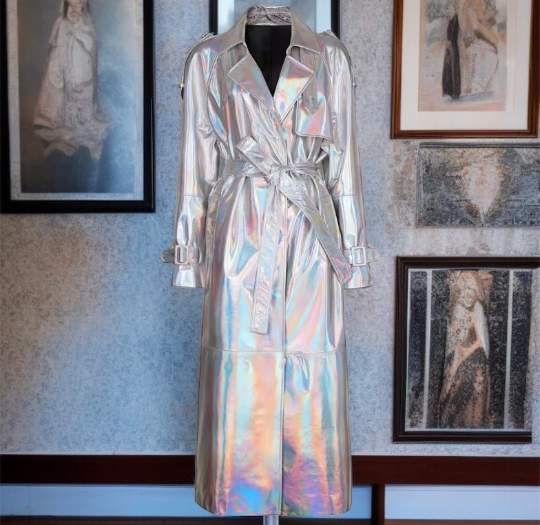 Płaszcz skórzany damski z naturalnej skóry srebrny,CHLOE MAXI NEO. Płaszcz skórzany damski z naturalnej CHLOE MAXI NEO wykonany z naturalnej skóry jagnięcej neonowej w kolorze srebrnym transparentnym.Płaszcz skórzany damski CHLOE MAXI NEO to model klasycznego płaszcza skórzanego bez zapięcia zakładany na bok delikatnie, przepasany paskiem w talli wygląda bardzo elegancko i świetnie się układa na kobiecej sylwetce, podkreślając jej atuty. Model wzbogacony klapami na ramionach i rękawach. Płaszcz skórzany CHLOE MAXI wykorzystasz w eleganckich, cosualowych jak i na co dzień sportowych stylizacjach.